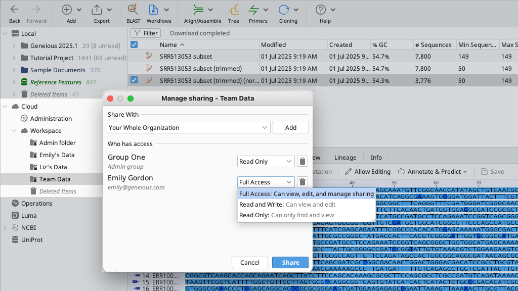 Collaborate with your team, work across computers, and securely backup your data with a Geneious Cloud workspace