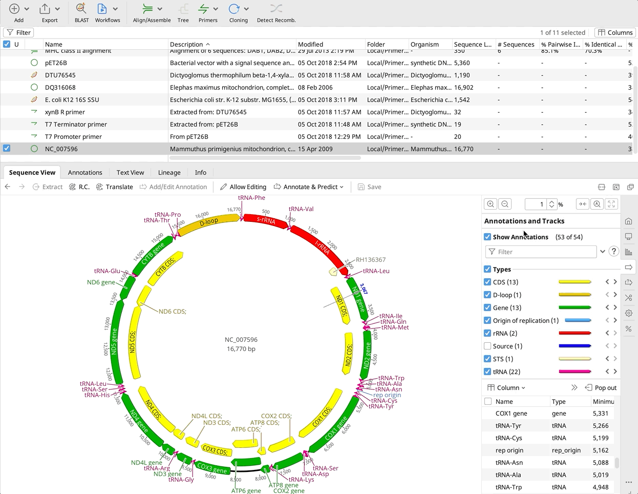 - Primers (oligos) appear as files with green arrow icons in your document table