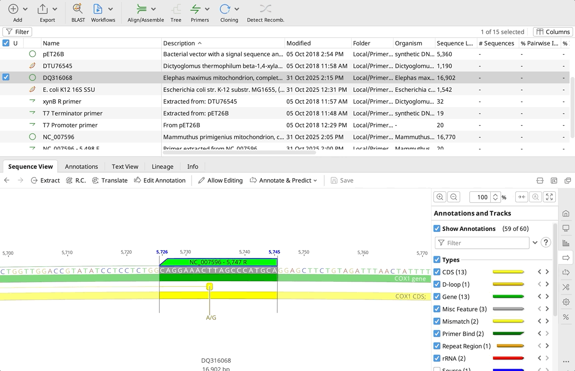 3. Extract primers: Click each primer annotation → Extract → Give meaningful names (e.g., "COX1_F" and "COX1_R")